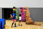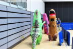 サウルスの着ぐるみと一緒に走るという形を考えました。我々が交替でティラノになり、